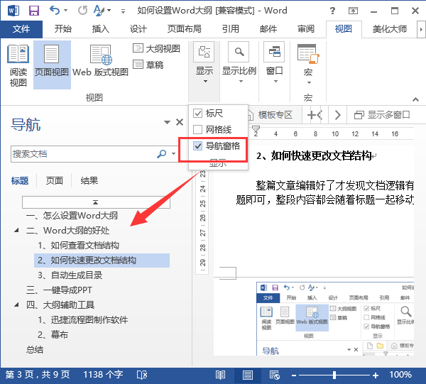 在Word使用大纲级别或设置样式后,我们可以通过【视图】导航栏中的【导航窗格】查看文档结构,结构设置十分清晰整洁。