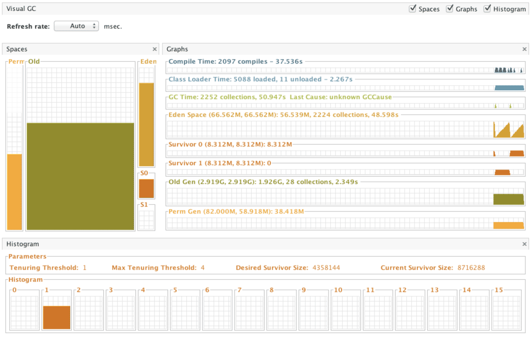 GUI GC监控由一个单独的图形化应用来完成,其中三个最常用的应用是”jconsole”, “jvisualvm” 和 “Visual GC”。