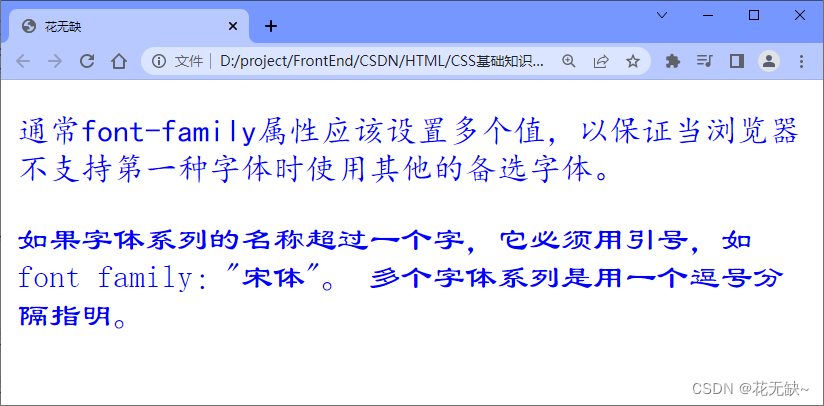 通常font-family属性应该设置多个值,以保证当浏览器不支持第一种字体时使用其他的备选字体。