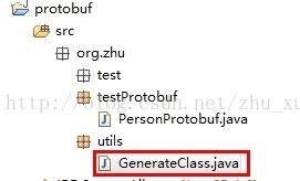 运行程序后,需刷新protobuf工程,这是你可以发现,在org,zhu,testProtobuf包下生成了一个PersonProtobuf.java类,参考如下: