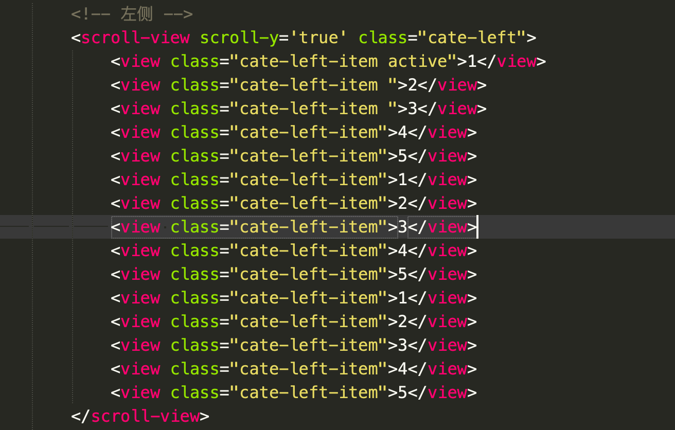 这是小程序的html样式,<scroll-view></scroll-view>可滚动视图区域。使用竖向滚动时,需要给scroll-view一个固定高度,view相当于div.