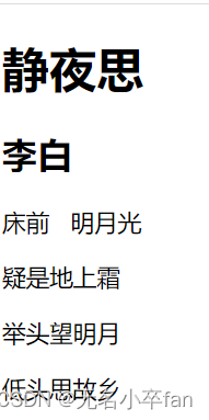 <h1>标题</h1>:标题标签,这里写最大的标题。这类标签还有h2,h3..h6,6级标签,文字大小依次递减,独占一行且都会加粗。