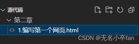(1)先创建一个文件夹,命名为“源代码”,将该文件夹一拖动的方式用vscode打开,然后再创建一个文件夹“第二章”,在第二章里创建一个新的文件”1.编写第一个网页.html”
