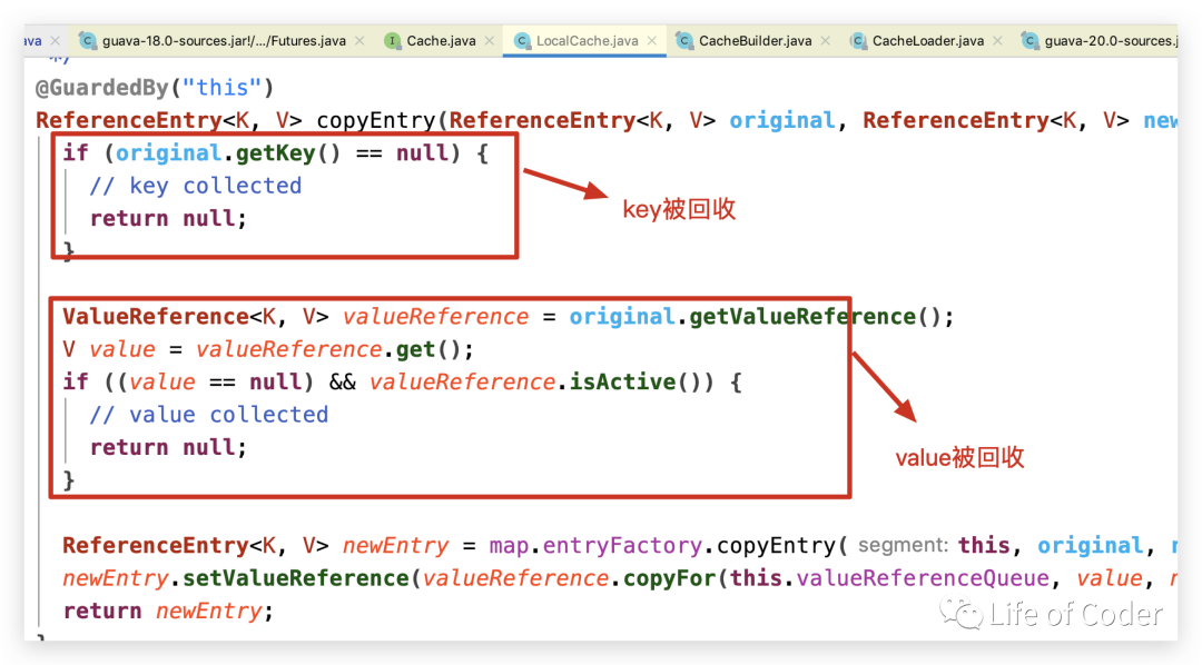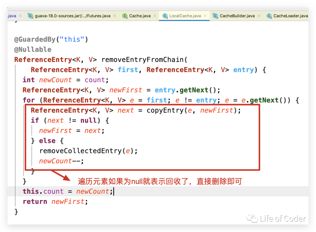 而Guava Cache也采用了类似的回收策略,在Guava Cache需要回收(删除)某个缓存项的时候,当Hash冲突之后,其需要从链表中一次往下查找该缓存项,再查找的过程中也会随便把扫描到缓存项回收(如果需要回收)了。