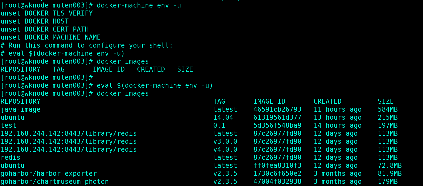 [root@wknode muten003]# eval $(docker-machine env -u)