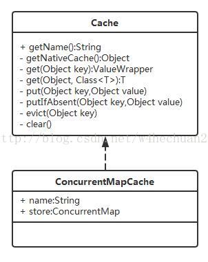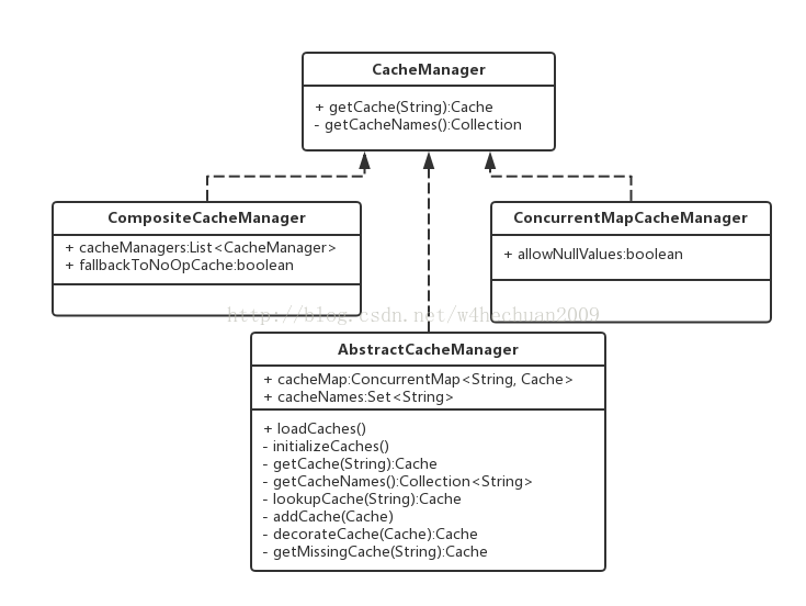 上图中,CacheManager接口中只有两个方法getCache(String)和getCacheNames(),显然,这两个方法的作用就是跟据名称获得Cache实例以及获得所有被管理的缓存的名称列表。