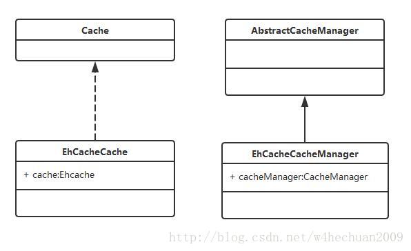 图中可看出,最重要的两个类就是EhCacheCache和EhCacheCacheManager,分别是Cache和AbstractCacheManager的子类实现类。这两个类中,对于父类抽象的方法的实现,都是委托它类部的Ehcache及net.sf.ehcache.CacheManager通过调用ehcache相关api来完成。