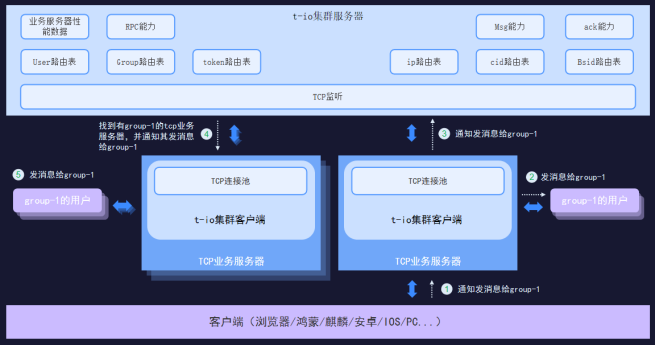 企业版t-io(集群版)内置了集群能力,用户只需要在启动的时候加几行配置代码,便能轻松拥有集群能力,这时可同时支撑1亿+长连接。