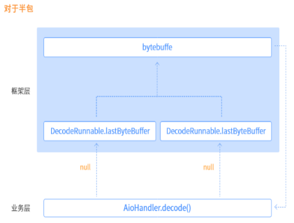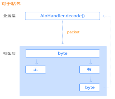 框架层已经做好半包和粘包的工作,业务层不需要考虑在传输过程中的数据包的结构,只需要按着业务协议解码即可。