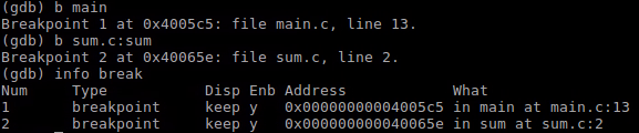 查看断点,通过info break查看断点列表。
