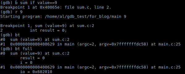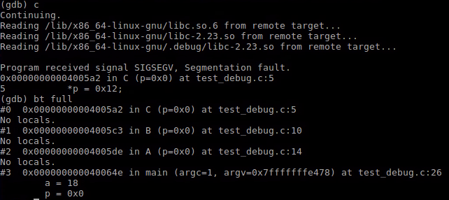 bt full:不仅显示backtrace,还显示局部变量