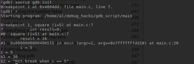 set logging on gdb.log b square if i == 5 commands bt full i locals p total print "Hit break when i == 5" end