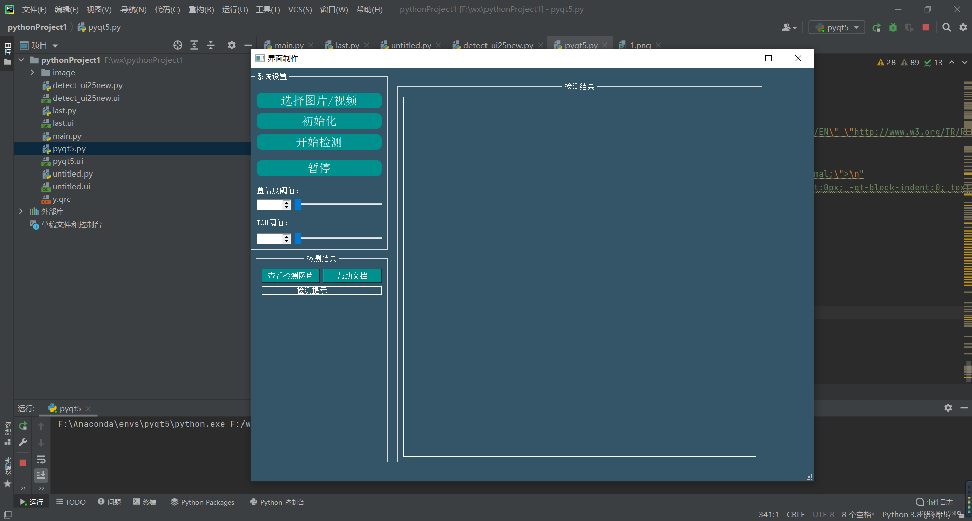 在pycharm上面生成的ui文件通过PyUIC转换成python文件,打开生成的python文件添加运行的关键代码: