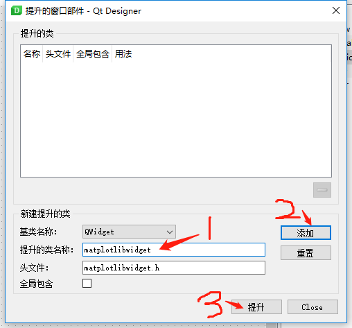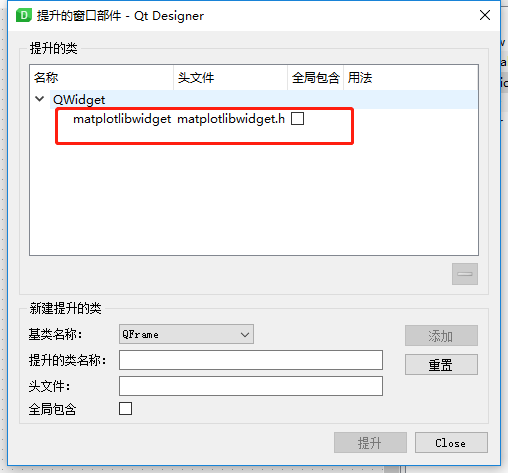 4、在“提升的类名称”栏输入:matplotlibwidget,会自动增加matplotlibwidget.h头文件,然后点击“添加”选项,上面的“提升的类”中会多一个刚刚添加的类。再点击“提升”即可。