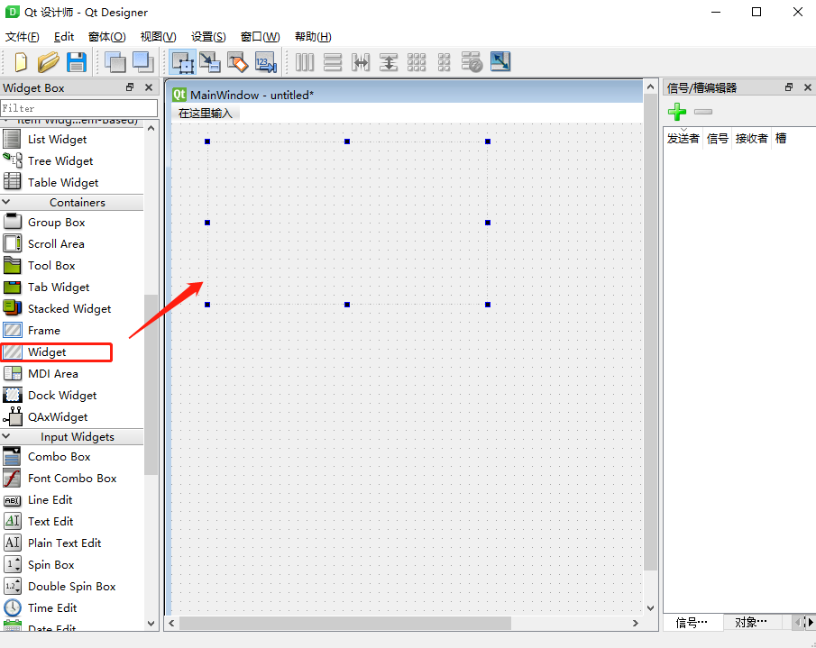 2、在Qt Designer中右边找到Widget,拖到Main Window的编程界面中。