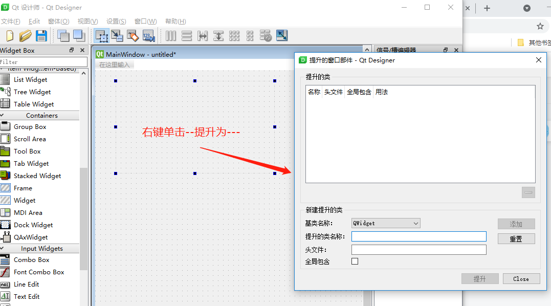 3、 右键单击Widget的方框,选择“提升为。。。"选项,打开“提升的窗口部件”对话框。