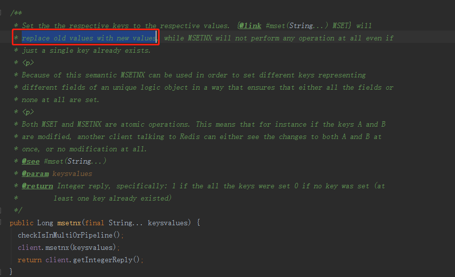 上图是msetnx的方法注释,还算比较清楚的写了设置key和value,也就是说参数中的可变参数不仅不能是1,而且只能是偶数,是以key-value的形式一对一对插入的。疑惑解决。自己sb了
