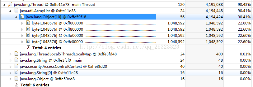 查看到是当前主线程ArrayList占用内存最大,点开之后可以看到引用了四个byte[]数组,