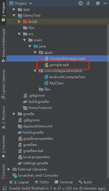 下面贴上测试用例代码,google.apk放在了文件夹中,测试用例包括Before(测试前的配置操作),After(测试后的销毁操作),Test(要进行测试的操作)