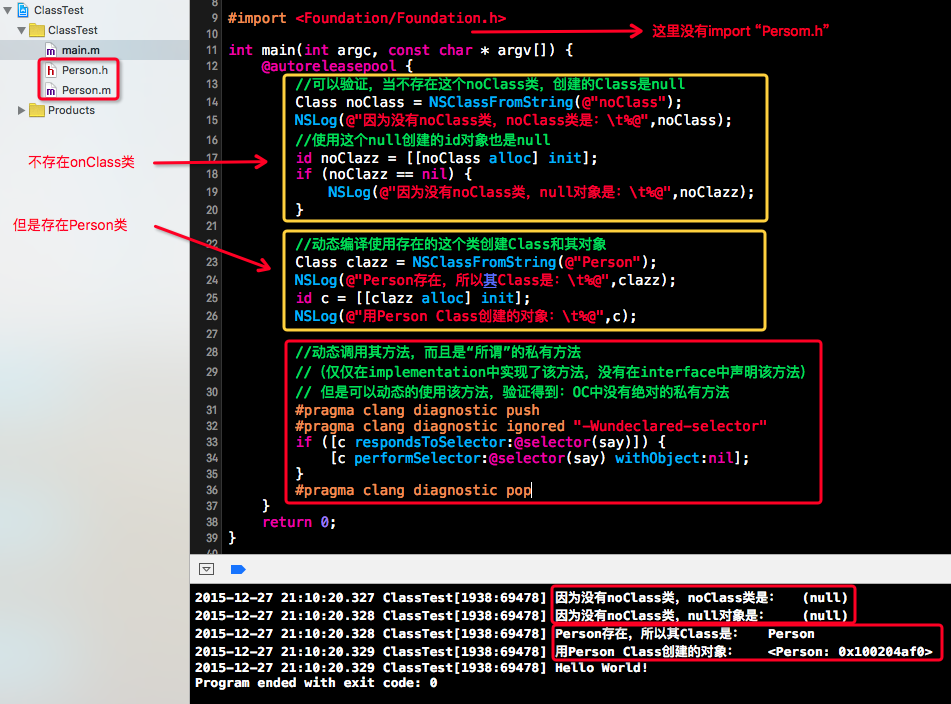 提醒:关于那个黄色字体"#pragma......"是用于让相关的警告不显示,因为在这里我没有导入Person类,就用了Person类的say方法,当然会提示没有这个方法的警告,这个请参考我的另一篇博文摘抄笔记:《让编译器对一些警告闭嘴》。