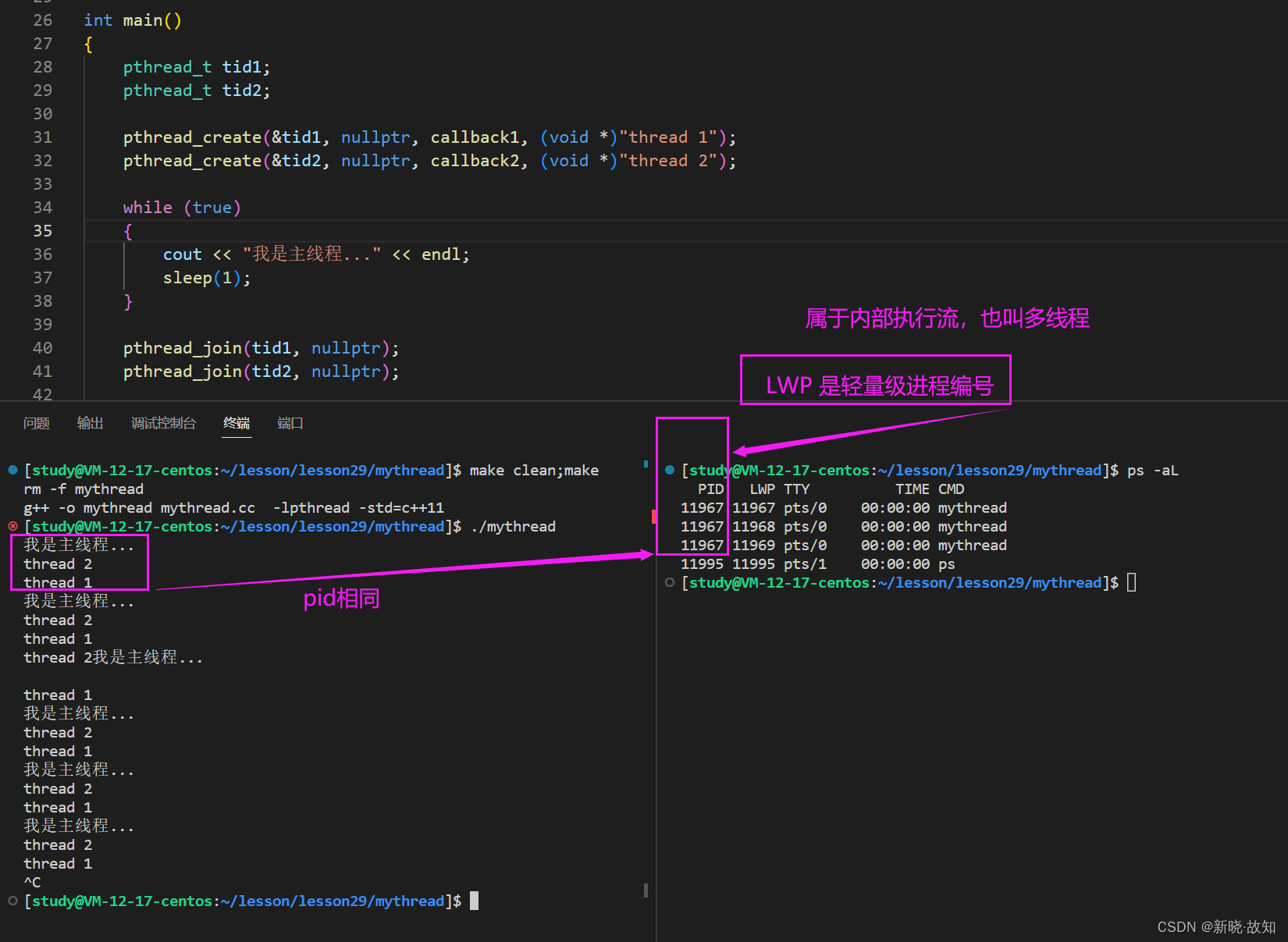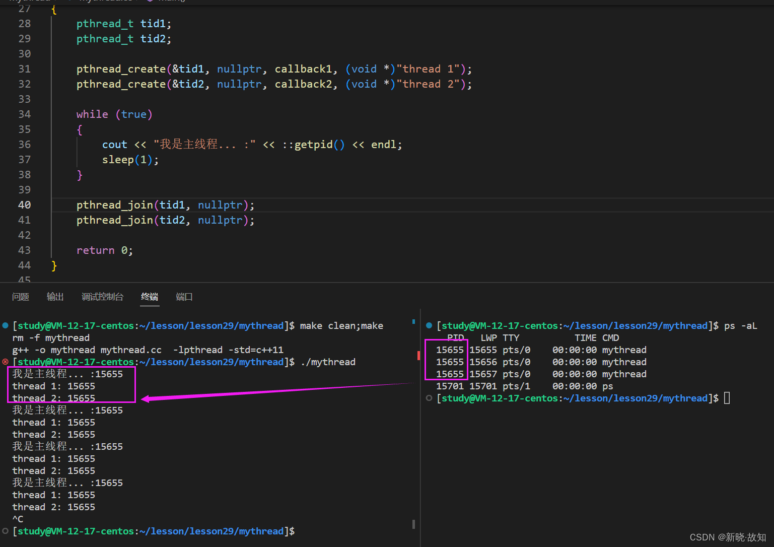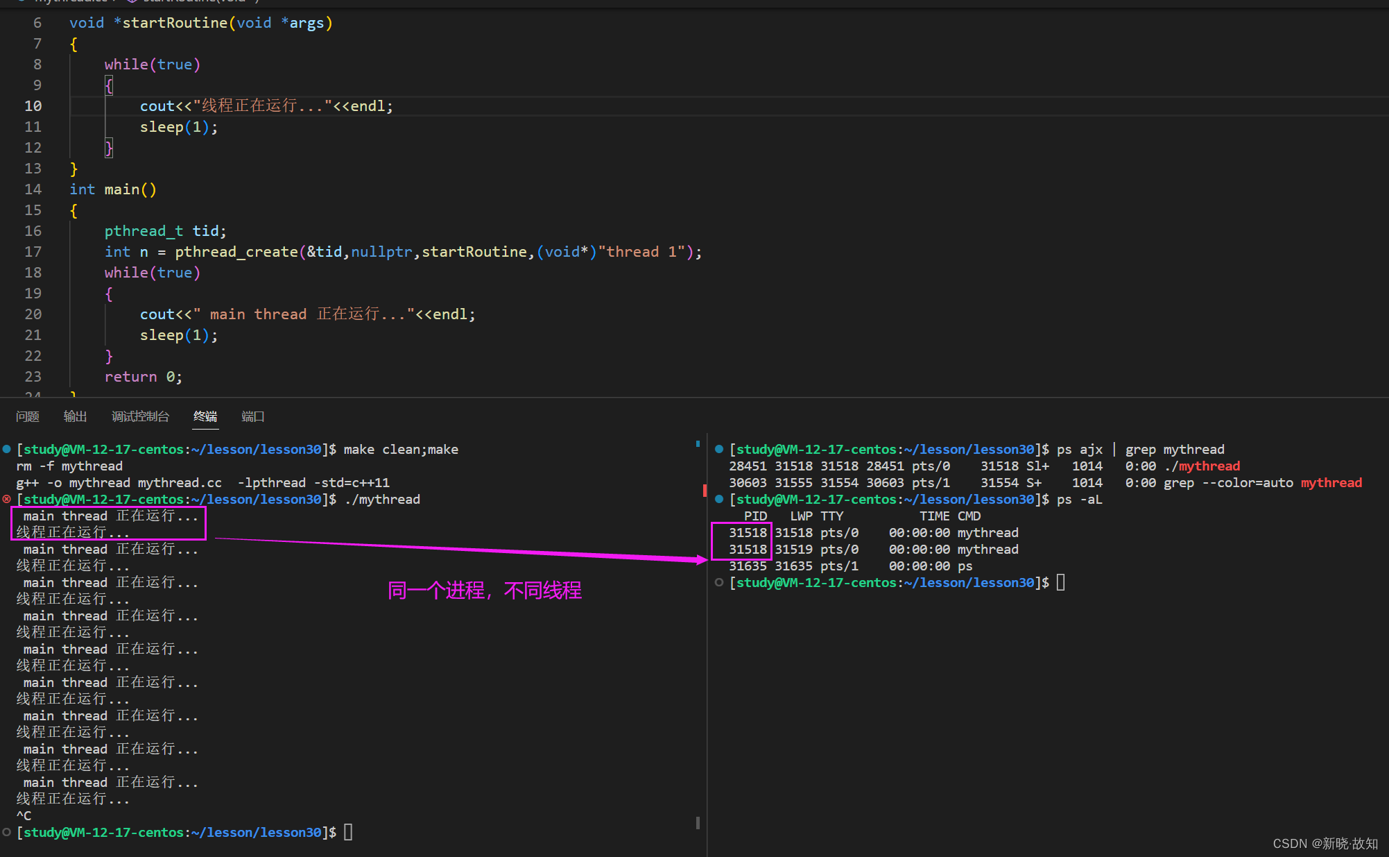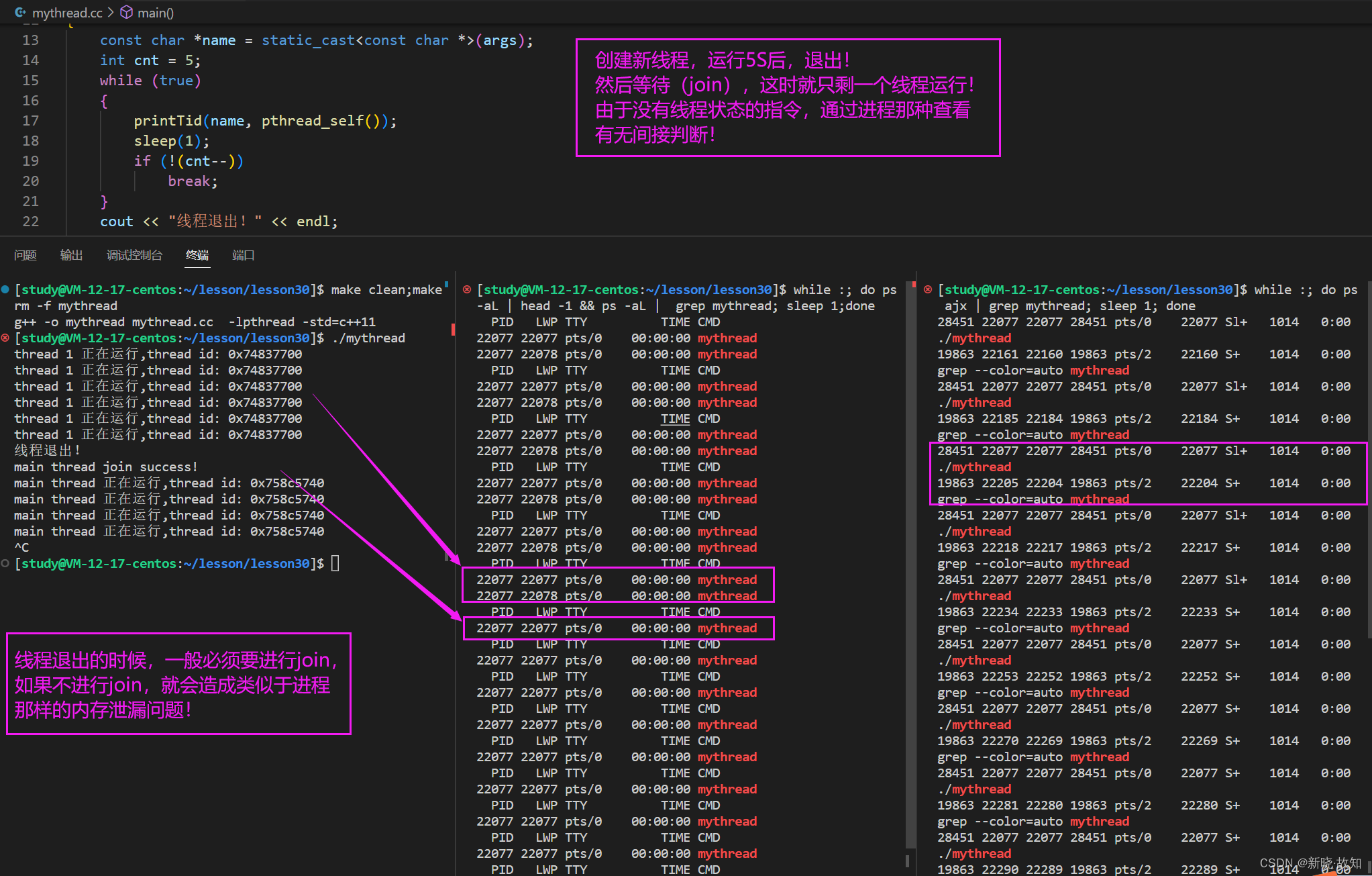 while :; do ps -aL | head -1 && ps -aL | grep mythread; sleep 1;donewhile :; do ps ajx | grep mythread; sleep 1; done线程退出的时候,一般需要进行join,否则就会造成类似于进程那样的内存泄漏问题!