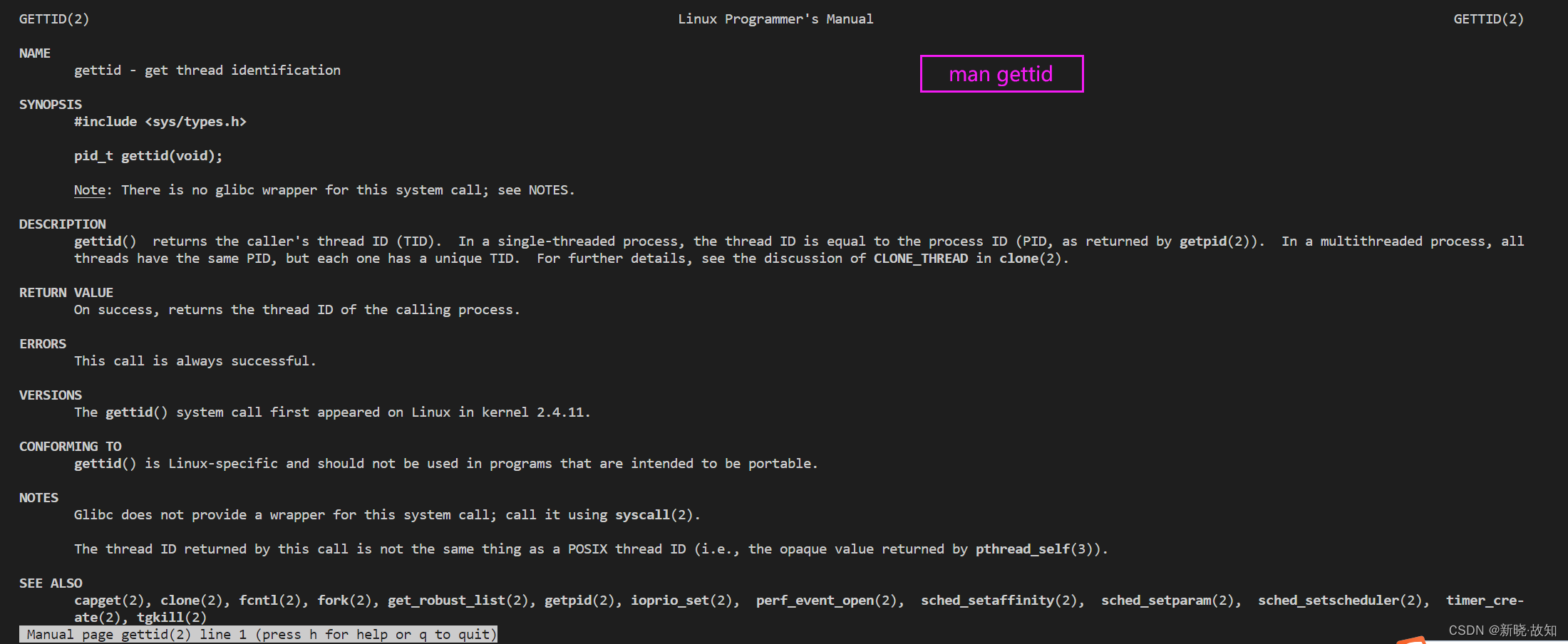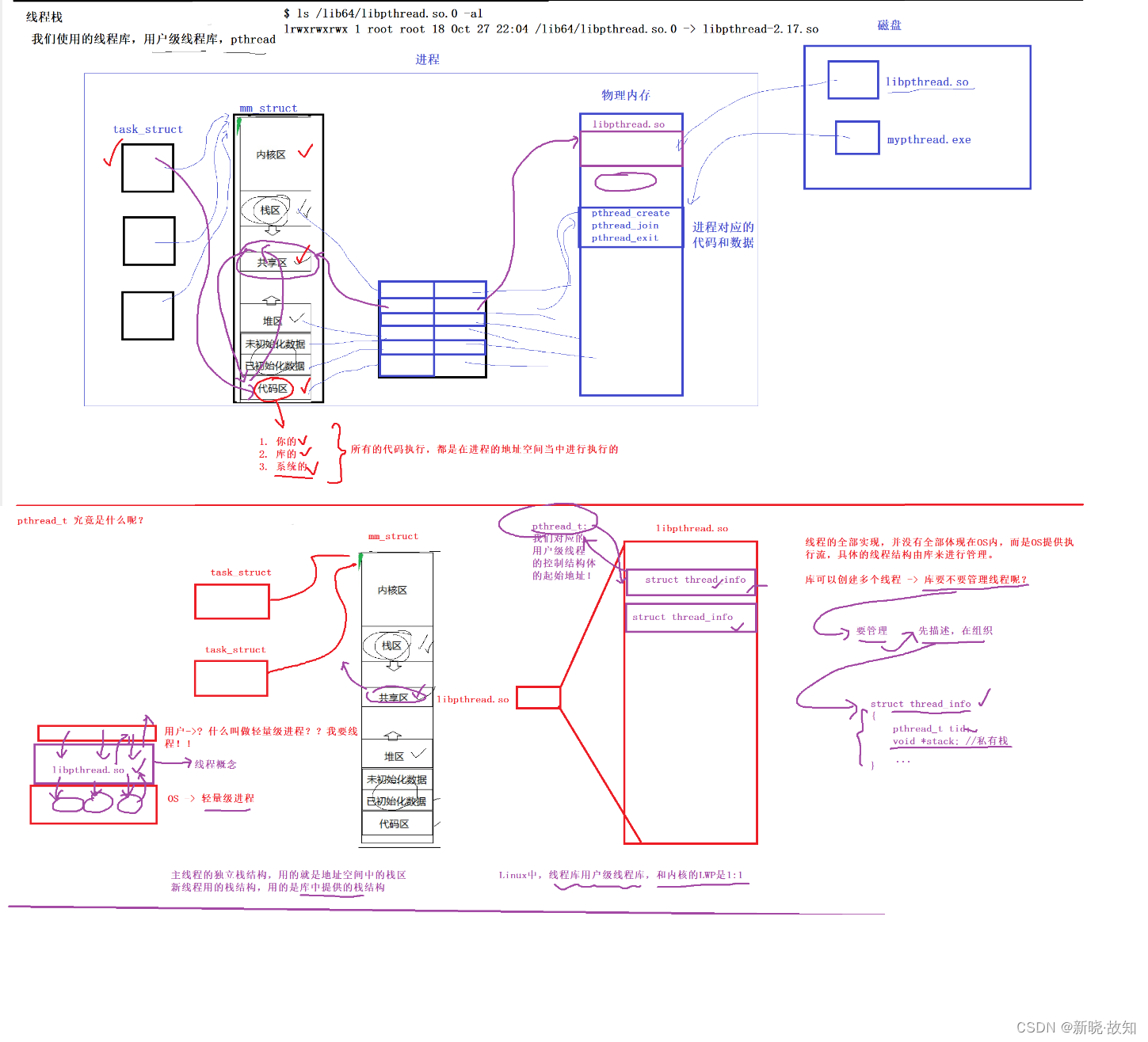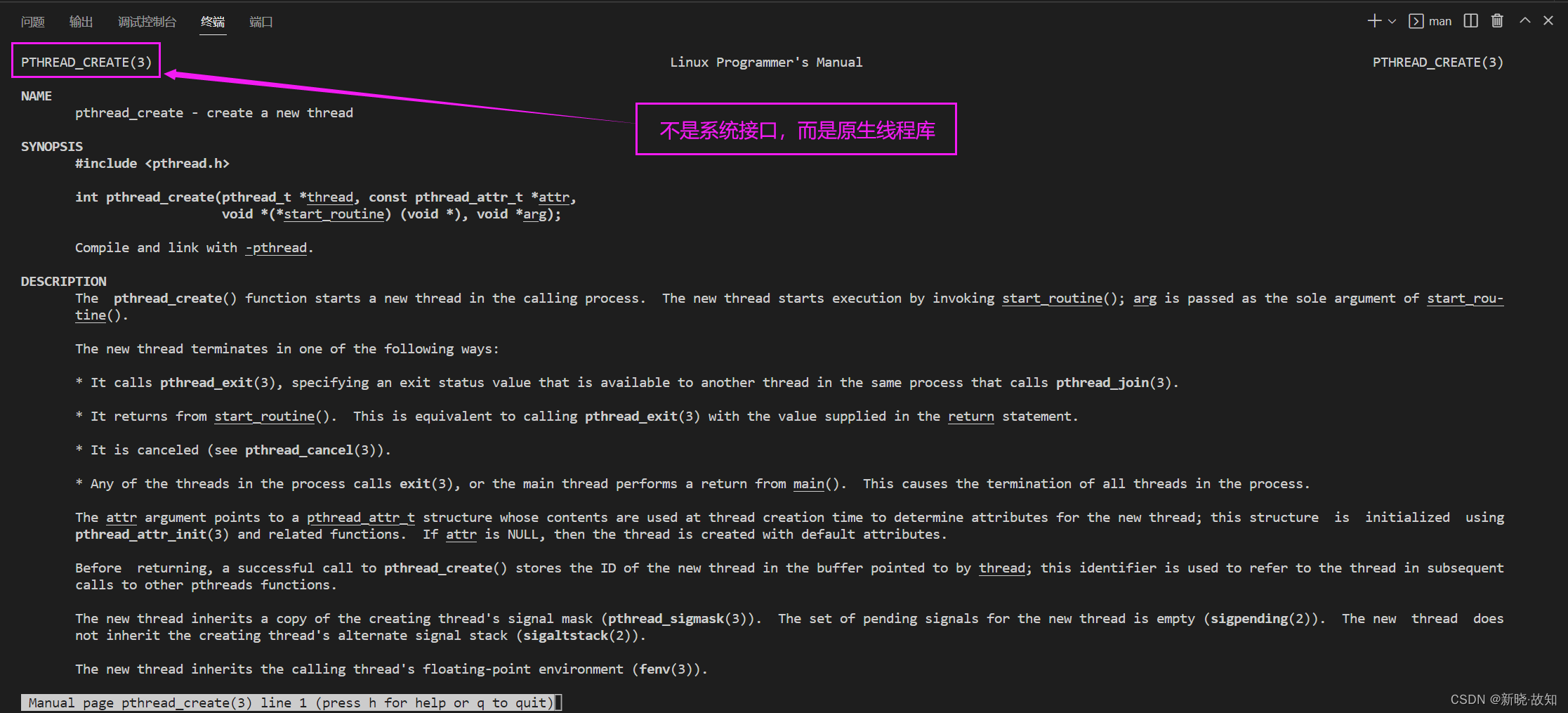 pthread_t pthread_self(void);pthread_t 到底是什么类型呢?取决于实现。对于 Linux 目前实现的 NPTL 实现而言, pthread_t 类型的线程 ID ,本质就是一个进程地址空间上的一个地址。![]()