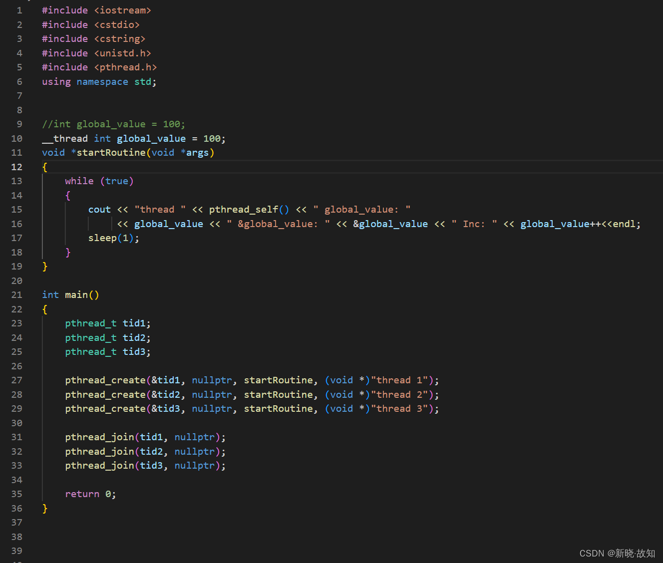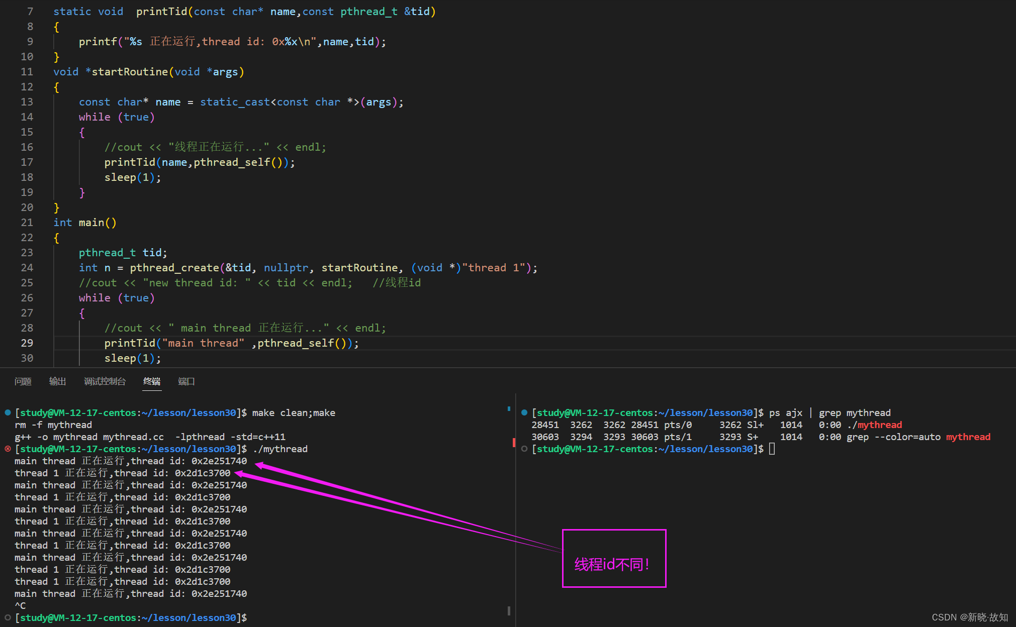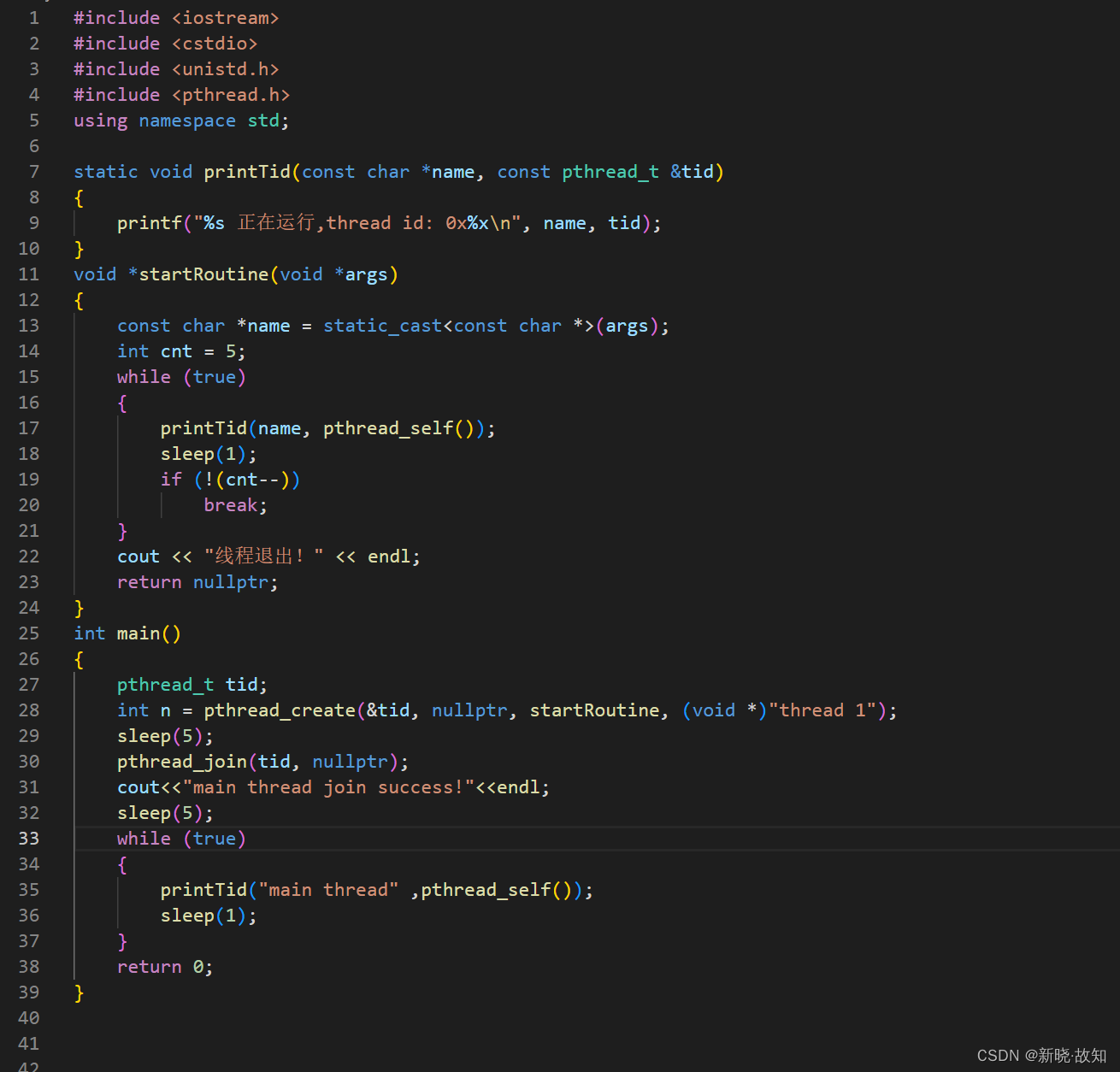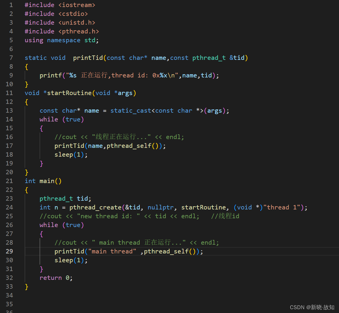 #include <iostream> #include <cstdio> #include <unistd.h> #include <pthread.h> using namespace std; static void printTid(const char* name,const pthread_t &tid) { printf("%s 正在运行,thread id: 0x%xn",name,tid); } void *startRoutine(void *args) { const char* name = static_cast<const char *>(args); while (true) { //cout << "线程正在运行..." << endl; printTid(name,pthread_self()); sleep(1); } } int main() { pthread_t tid; int n = pthread_create(&tid, nullptr, startRoutine, (void *)"thread 1"); //cout << "new thread id: " << tid << endl; //线程id while (true) { //cout << " main thread 正在运行..." << endl; printTid("main thread" ,pthread_self()); sleep(1); } return 0; }