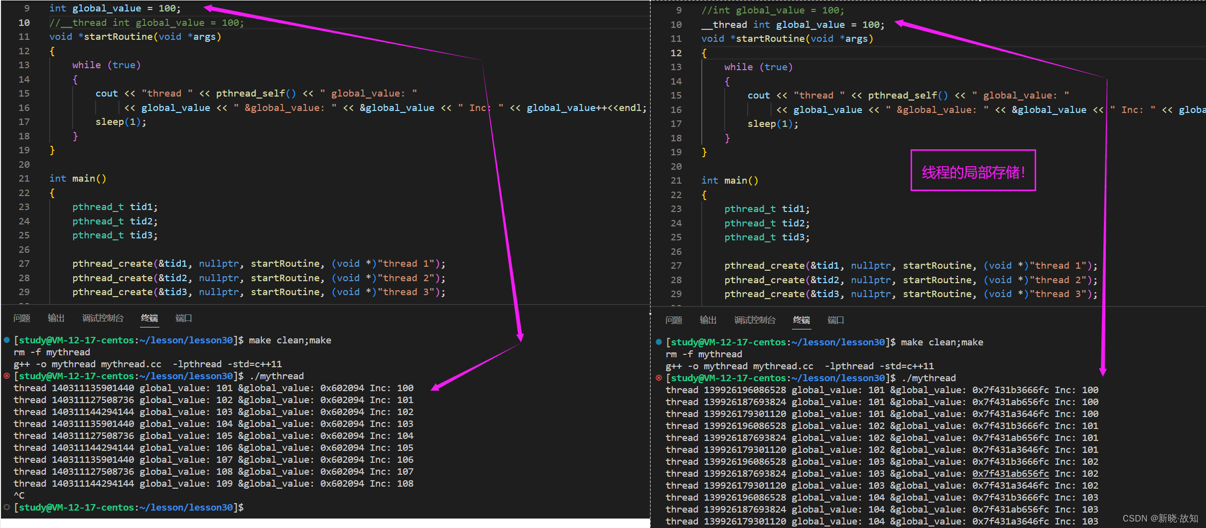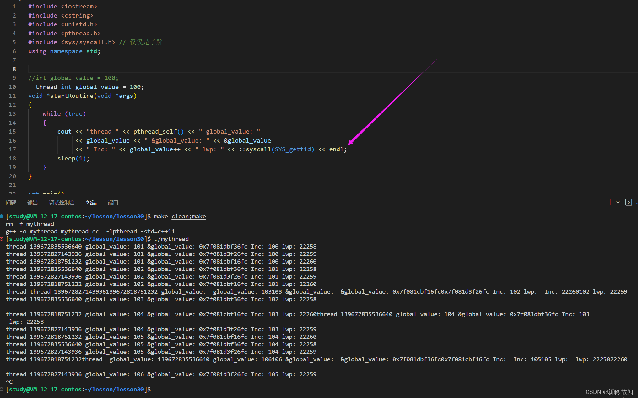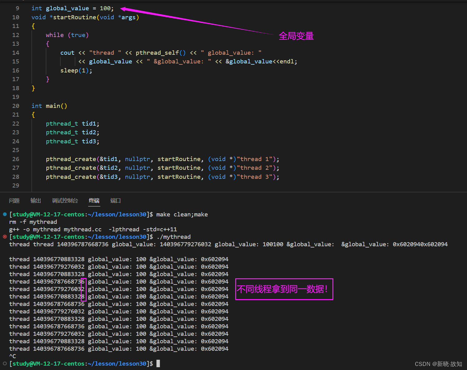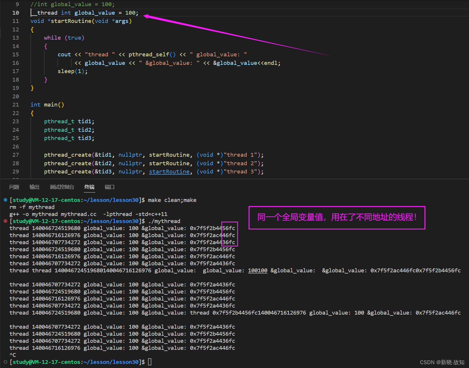 #include <iostream> #include <cstdio> #include <unistd.h> #include <pthread.h> using namespace std; static void printTid(const char* name,const pthread_t &tid) { printf("%s 正在运行,thread id: 0x%xn",name,tid); } void *startRoutine(void *args) { const char* name = static_cast<const char *>(args); while (true) { //cout << "线程正在运行..." << endl; printTid(name,pthread_self()); sleep(1); } } int main() { pthread_t tid; int n = pthread_create(&tid, nullptr, startRoutine, (void *)"thread 1"); //cout << "new thread id: " << tid << endl; //线程id while (true) { //cout << " main thread 正在运行..." << endl; printTid("main thread" ,pthread_self()); sleep(1); } return 0; }