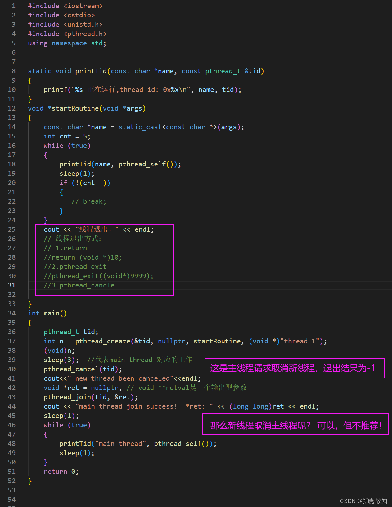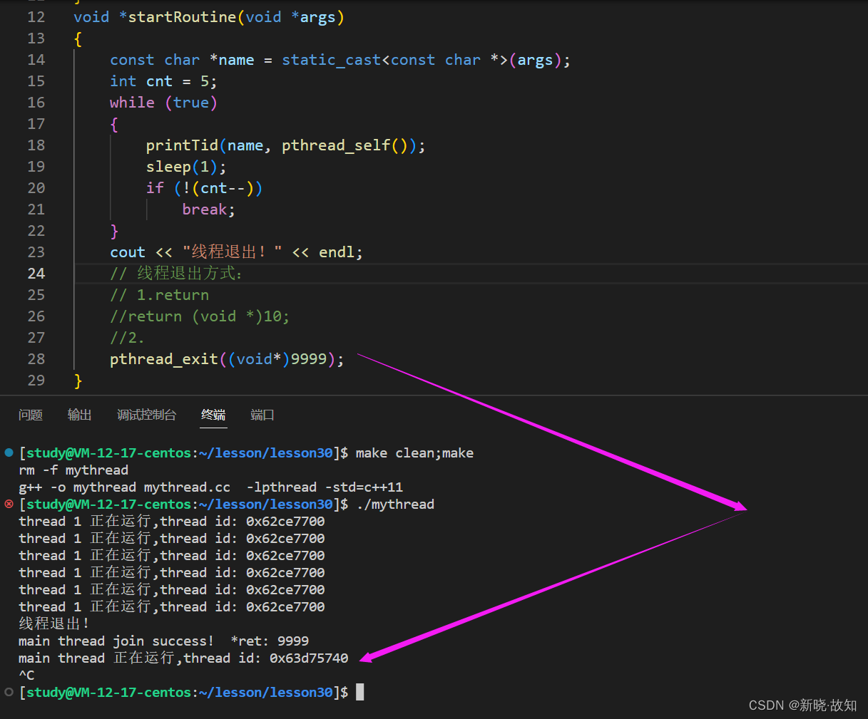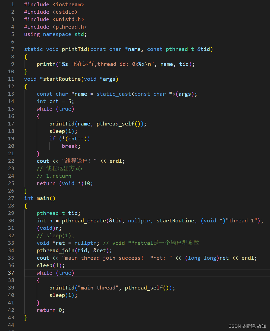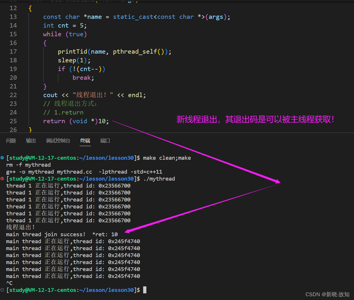 #include <iostream> #include <cstdio> #include <unistd.h> #include <pthread.h> using namespace std; static void printTid(const char *name, const pthread_t &tid) { printf("%s 正在运行,thread id: 0x%xn", name, tid); } void *startRoutine(void *args) { const char *name = static_cast<const char *>(args); int cnt = 5; while (true) { printTid(name, pthread_self()); sleep(1); if (!(cnt--)) break; } cout << "线程退出!" << endl; // 线程退出方式: // 1.return return (void *)10; } int main() { pthread_t tid; int n = pthread_create(&tid, nullptr, startRoutine, (void *)"thread 1"); (void)n; // sleep(1); void *ret = nullptr; // void **retval是一个输出型参数 pthread_join(tid, &ret); cout << "main thread join success! *ret: " << (long long)ret << endl; sleep(1); while (true) { printTid("main thread", pthread_self()); sleep(1); } return 0; }