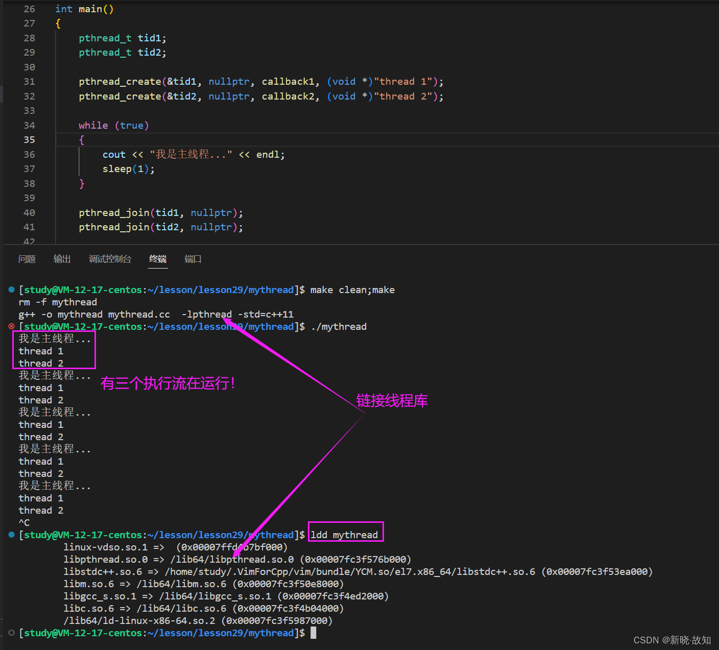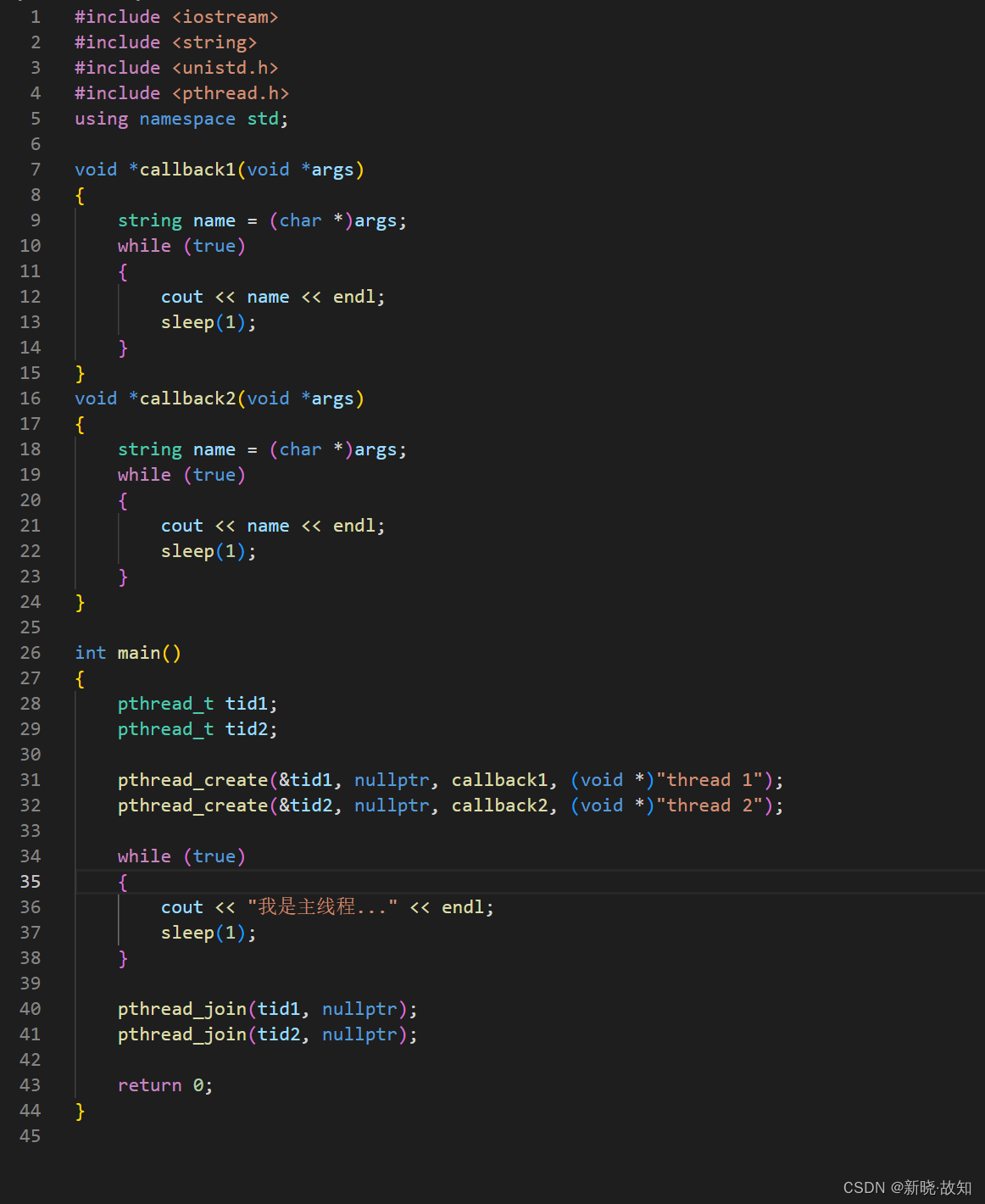 #include <iostream> #include <string> #include <unistd.h> #include <pthread.h> using namespace std; void *callback1(void *args) { string name = (char *)args; while (true) { cout << name << ": " << ::getpid() << endl; sleep(1); } } void *callback2(void *args) { string name = (char *)args; while (true) { cout << name << ": " << ::getpid() << endl; sleep(1); } } int main() { pthread_t tid1; pthread_t tid2; pthread_create(&tid1, nullptr, callback1, (void *)"thread 1"); pthread_create(&tid2, nullptr, callback2, (void *)"thread 2"); while (true) { cout << "我是主线程... :" << ::getpid() << endl; sleep(1); } pthread_join(tid1, nullptr); pthread_join(tid2, nullptr); return 0; }C++也支持线程,其封装的是系统原生的pthread。