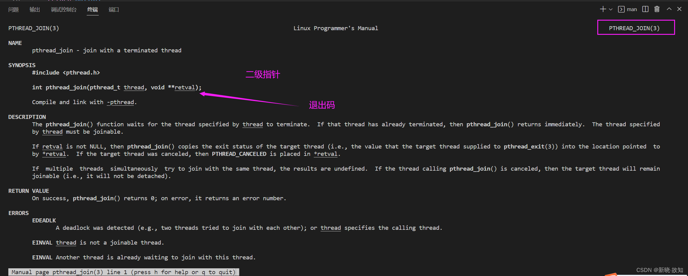功能:等待线程结束 原型 int pthread_join(pthread_t thread, void **value_ptr); 参数 thread:线程ID value_ptr:它指向一个指针,后者指向线程的返回值 返回值:成功返回0;失败返回错误码调用该函数的线程将挂起等待 , 直到 id 为 thread 的线程终止。 thread 线程以不同的方法终止 , 通过 pthread_join 得到的终止状态是不同的,总结如下:1. 如果 thread 线程通过 return 返回 ,value_ ptr 所指向的单元里存放的是 thread 线程函数的返回值。2. 如果 thread 线程被别的线程调用 pthread_ cancel 异常终掉 ,value_ ptr 所指向的单元里存放的是常数PTHREAD_ CANCELED。3. 如果 thread 线程是自己调用 pthread_exit 终止的 ,value_ptr 所指向的单元存放的是传给 pthread_exit 的参数。4. 如果对 thread 线程的终止状态不感兴趣 , 可以传 NULL 给value_ ptr参数。![]()