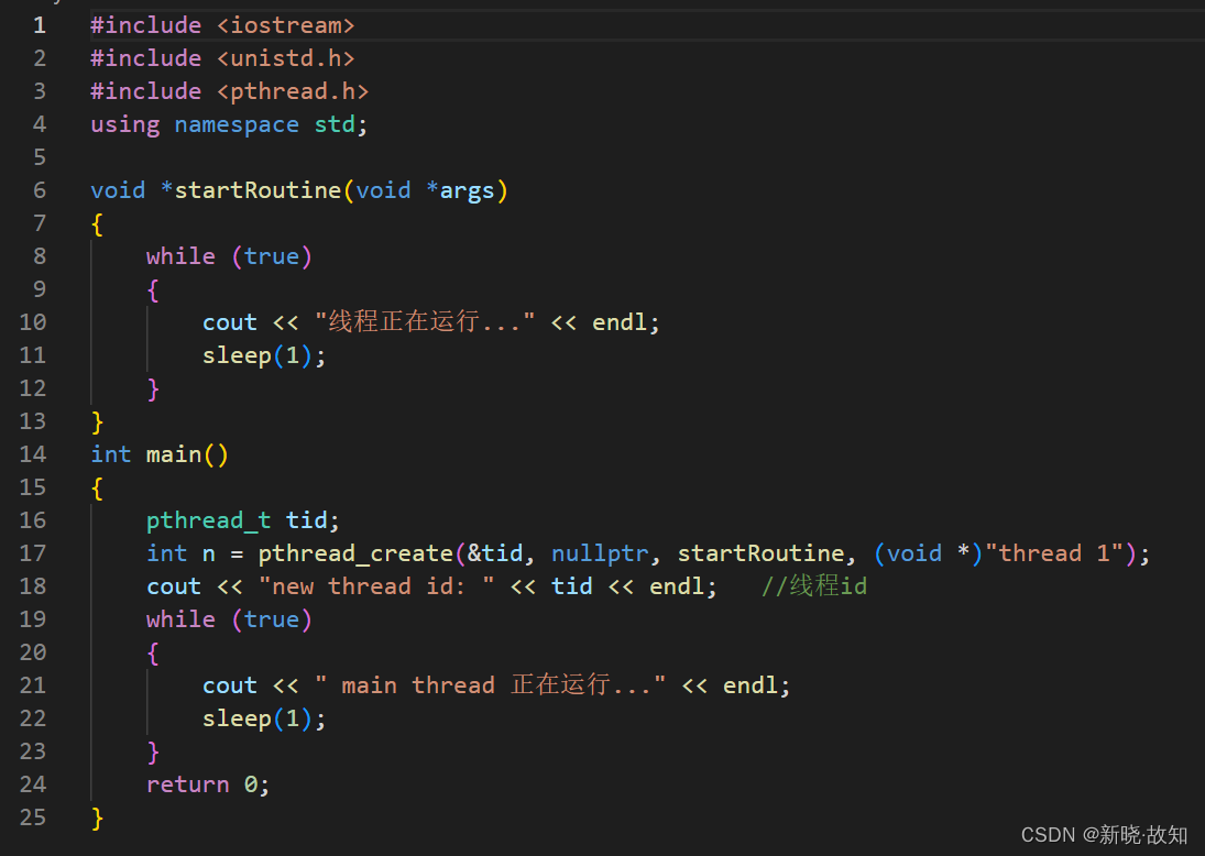 #include <iostream> #include <unistd.h> #include <pthread.h> using namespace std; void *startRoutine(void *args) { while (true) { cout << "线程正在运行..." << endl; sleep(1); } } int main() { pthread_t tid; int n = pthread_create(&tid, nullptr, startRoutine, (void *)"thread 1"); cout << "new thread id: " << tid << endl; //线程id while (true) { cout << " main thread 正在运行..." << endl; sleep(1); } return 0; }