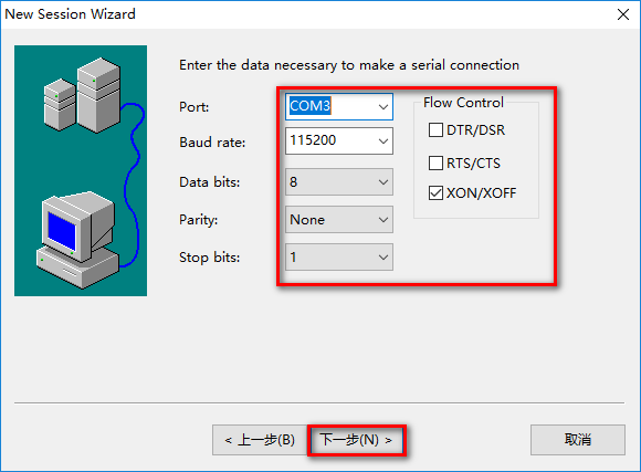 波特率选择115200,端口选择刚刚查看到的COM3,同时右边栏勾选XON/XOFF,并取消勾选RTS/CTS。