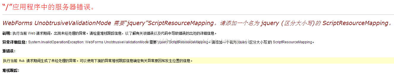 我是靠谱客的博主 活力金毛,这篇文章主要介绍“WebForms UnobtrusiveValidationMode 需要“jquery”ScriptResourceMapping,现在分享给大家,希望可以做个参考。