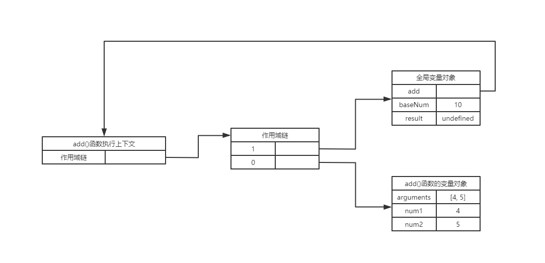add()函数的执行上下文内有作用域链,其是一个包含指针的列表,列表第 0 位的指针指向 add() 函数的变量对象(add() 函数的作用域),列表的第 1 位的指针指向全局的变量对象(全局作用域)。