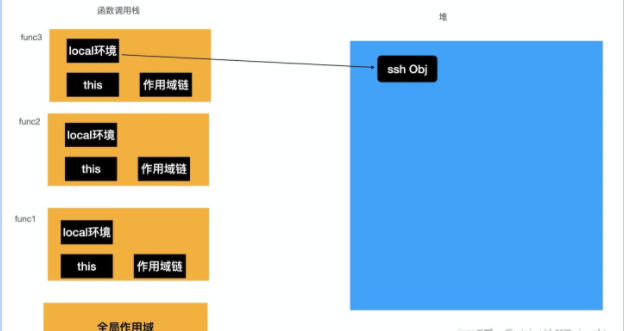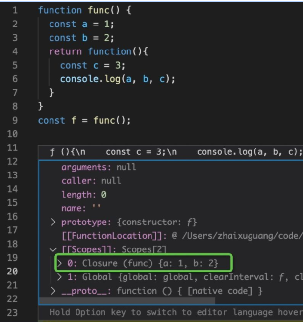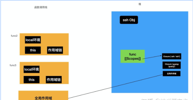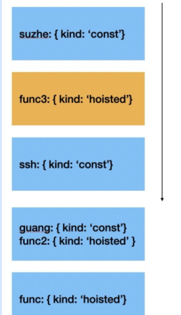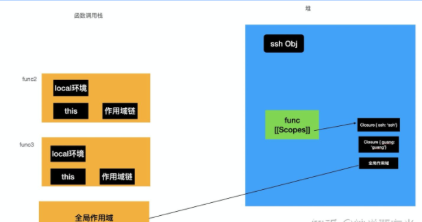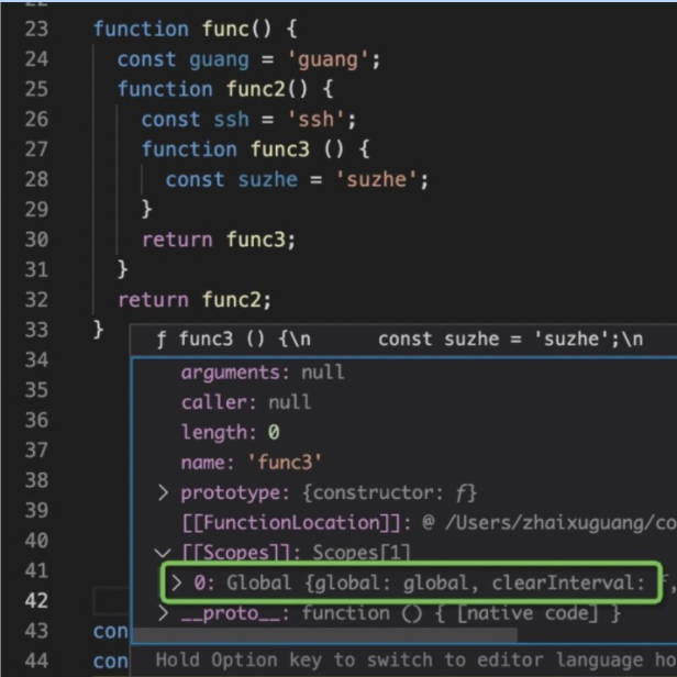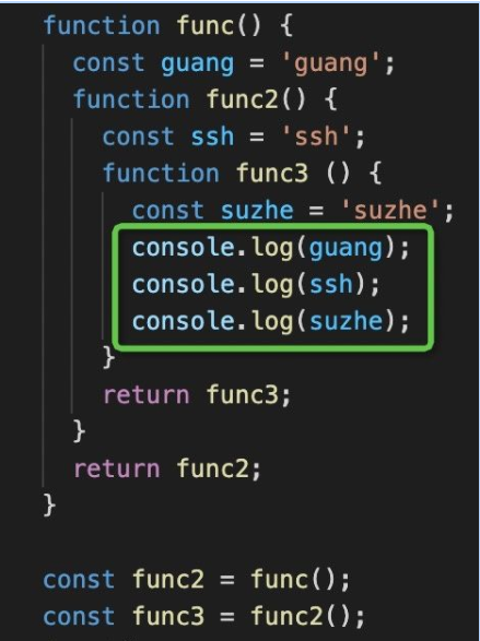 function func() { const guang = 'guang'; function func2() { const ssh = 'ssh'; function func3 () { const suzhe = 'suzhe'; } return func3; } return func2; } const func2 = func();