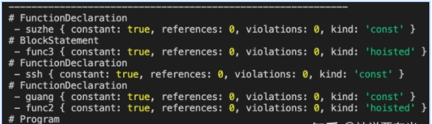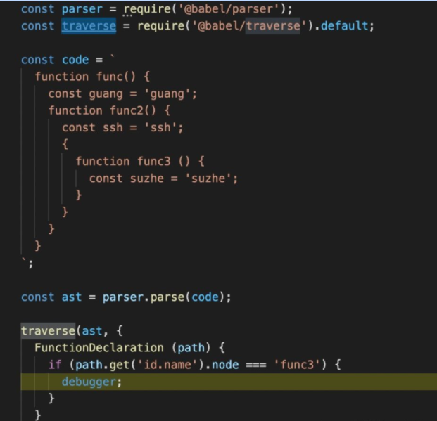 const parser = require('@babel/parser'); const traverse = require('@babel/traverse').default; const code = ` function func() { const guang = 'guang'; function func2() { const ssh = 'ssh'; { function func3 () { const suzhe = 'suzhe'; } } } } `; const ast = parser.parse(code); traverse(ast, { FunctionDeclaration (path) { if (path.get('id.name').node === 'func3') { console.log(path.scope.dump()); } } })