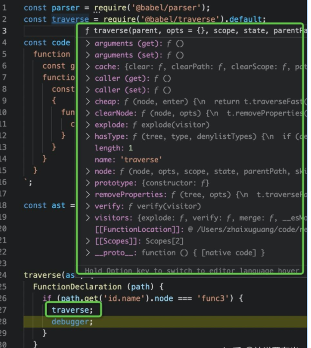 这个 traverse,明明能访问到的,为啥就是不显示信息呢?是 debugger 做的太烂了么? 不是的,如果你不知道原因,那是因为你还不理解闭包,因为这个 FunctionDeclaration 的函数是一个回调函数,明显是在另一个函数内调用的,就需要在创建的时候打包带走这个环境内的东西,根据只打包必要的环境的原则(不浪费内存),traverse 没有被引用(refer),自然就不打包了。并不是 debugger 有 bug 了。 所以我们只要访问一下,就能在调试的时候访问到了。