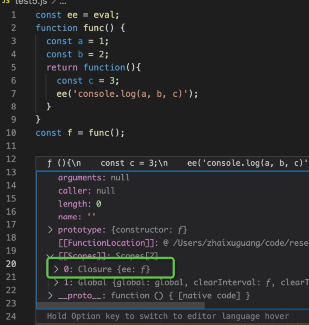 是不是突然知道为啥调试的时候不能看一些变量的信息了,能解释清楚这个现象,就算理解闭包了。 eval 再来思考一个问题: 闭包需要扫描函数内的标识符,做静态分析,那 eval 怎么办,他有可能内容是从网络记载的,从磁盘读取的等等,内容是动态的。用静态去分析动态是不可能没 bug 的。怎么办? 没错,eval 确实没法分析外部引用,也就没法打包闭包,这种就特殊处理一下,打包整个作用域就好了。 验证一下:
