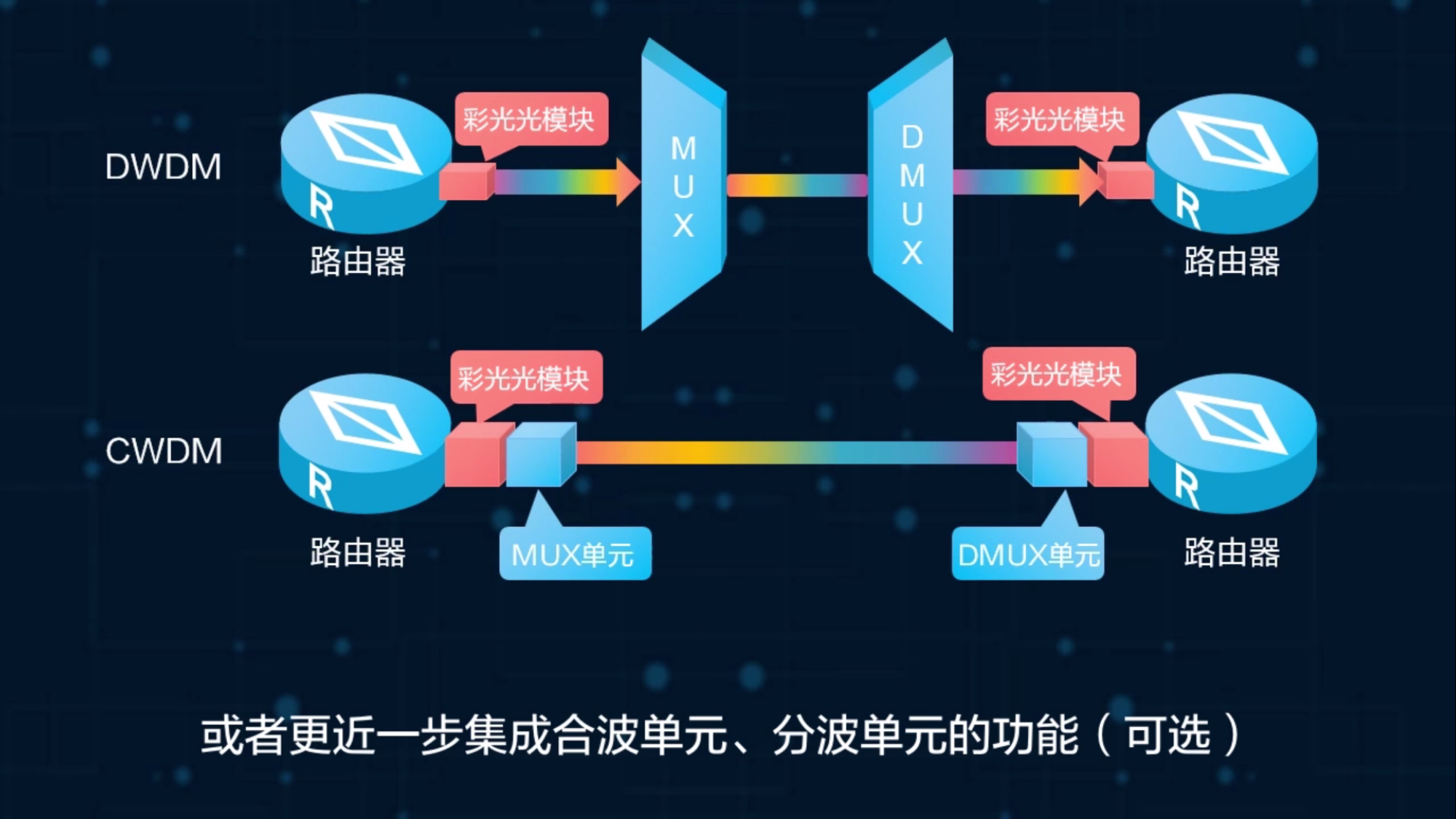 在传统的IP+光网络中,路由器采用灰光光模块链接波分设备的光波长转换单元(OTU),OTU将灰光转换为标准的彩光,转换后的彩光再接入合波单元MUX进行传输,这种方案,需要单独的波分设备才能完成。