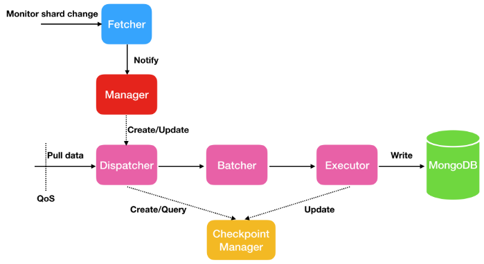 Fetcher线程负责感知stream中shard的变化,Manager负责进行消息的通知,或者创建新的Dispatcher进行消息的处理,一个shard对应一个Dispatcher。Dispatcher从源端拉取增量数据,并通过Batcher进行数据解析和打包整合,然后通过executor进行写入到MongoDB,同时会更新checkpoint。另外,如果是断点续传,那么Dispatcher会从旧的checkpoint位点开始拉取,而不是从头开始拉。
