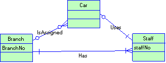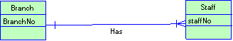 为了图形化表示1:1关系的,在关系的两端放上,0..1或者1..1表示他们之间的描述关系,为了表示一个员工管理0到1个公司,在Branch的一端放上0..1的字样,为了表示一个分公司必须由一个员工管理,在Staff的一端放上1..1,在上图中左边的