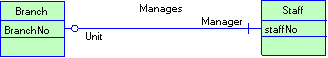 表示0..1,同时也表示是可选参与,即当Staff的一个实体确定时,他所管理的分公司可以有,或者没有。而在右边的