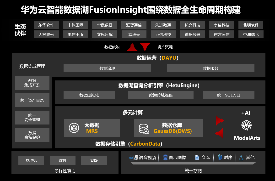 同时,为标准化多样性数据,一站式数据运营平台 DAYU 向下可接入日志、文本、视频、音频、图片等各类型数据,基于多样性算力与 CarbonData 实现全局一份数据的统一格式存储;向上为伙伴开发 50+数据集成开发 API,使能数据,携手生态伙伴打造各行业应用。