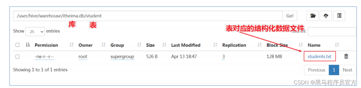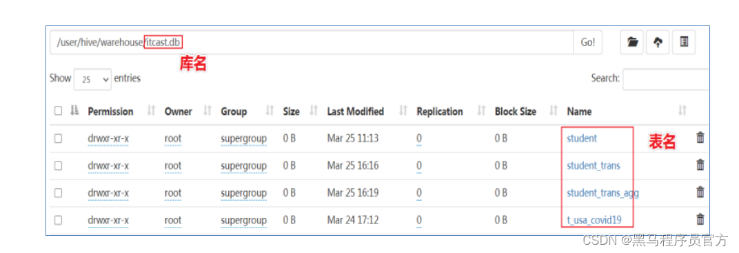 - 在Hive中建表成功之后,就会在HDFS上创建一个与之对应的文件夹,且文件夹名字就是表名;
