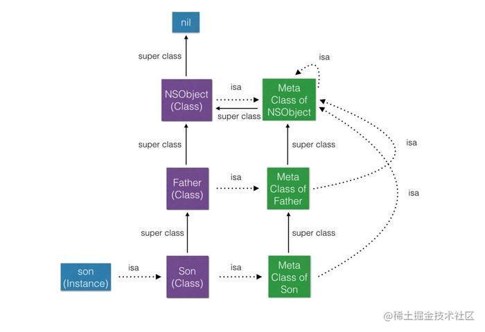 3.每一个Meta Class的super class指针指向它原本Class的 Super Class的Meta Class (这里最上层的NSObject的Meta Class的super class指针还是指向自己)
