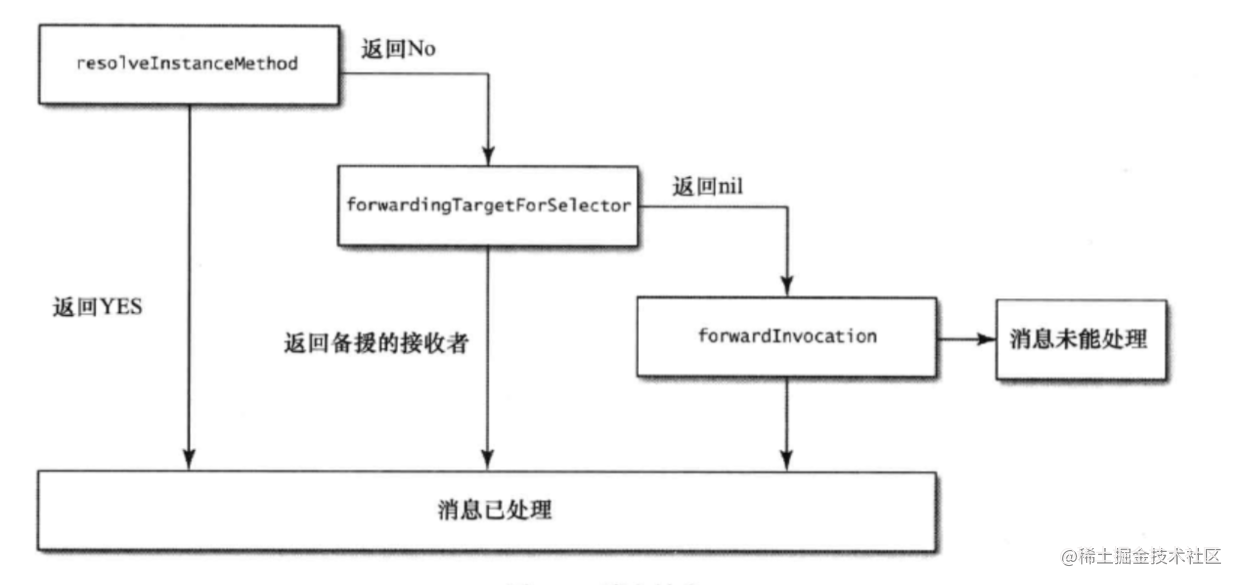 首先区分两个基本概念:> 1 .消息传递:对象正常解读消息,传递过去(见上一条)。> 2 .消息转发:对象无法解读消息,之后进行消息转发。##### 消息转发完整流程图: