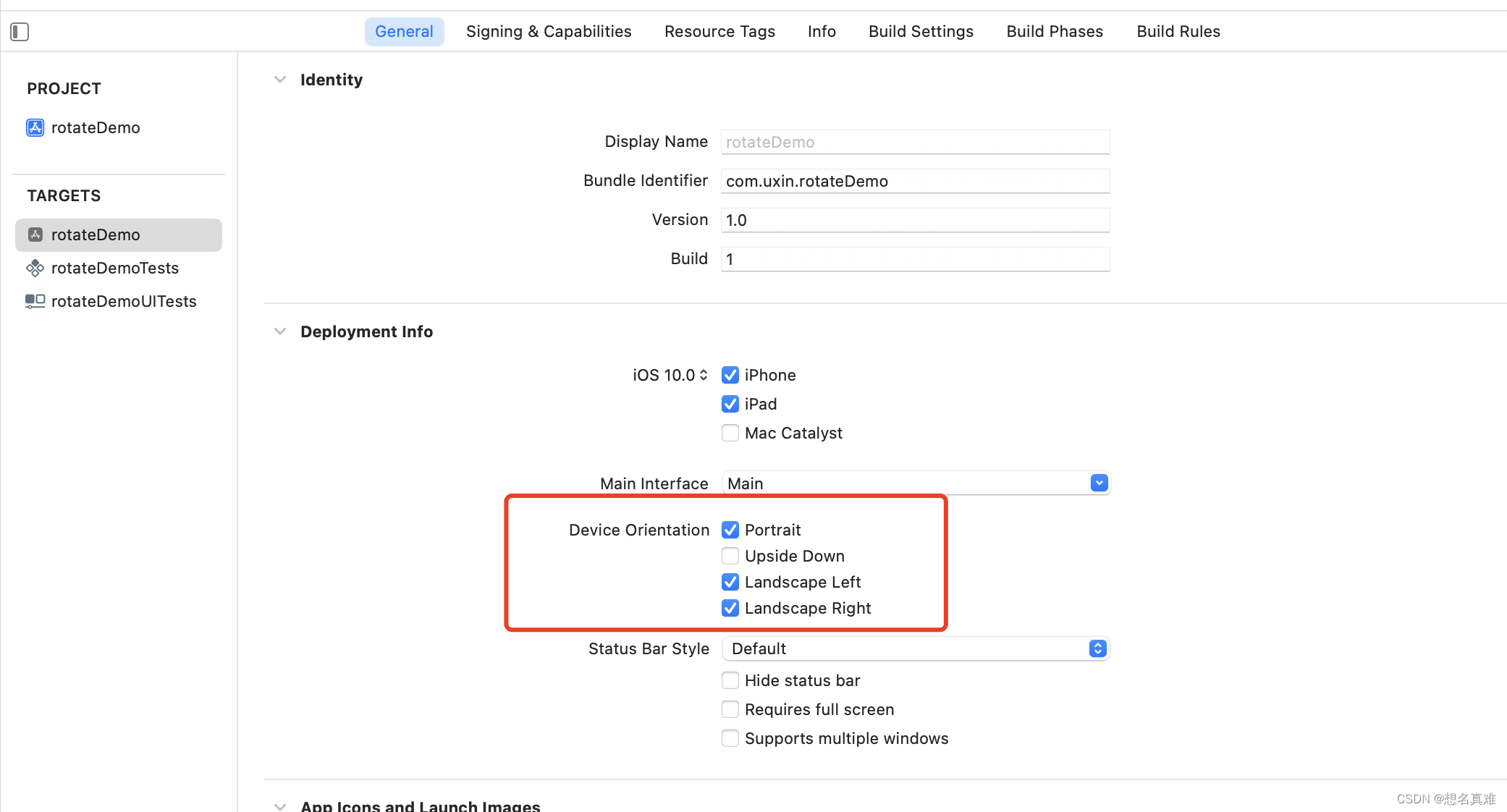 在项目中的AppDelegate文件中通过代码进行配置, 这样的配置更加灵活, 能通过pad, 手机做不同的逻辑, 此处还可以作为app能否支持旋转的总开关,
