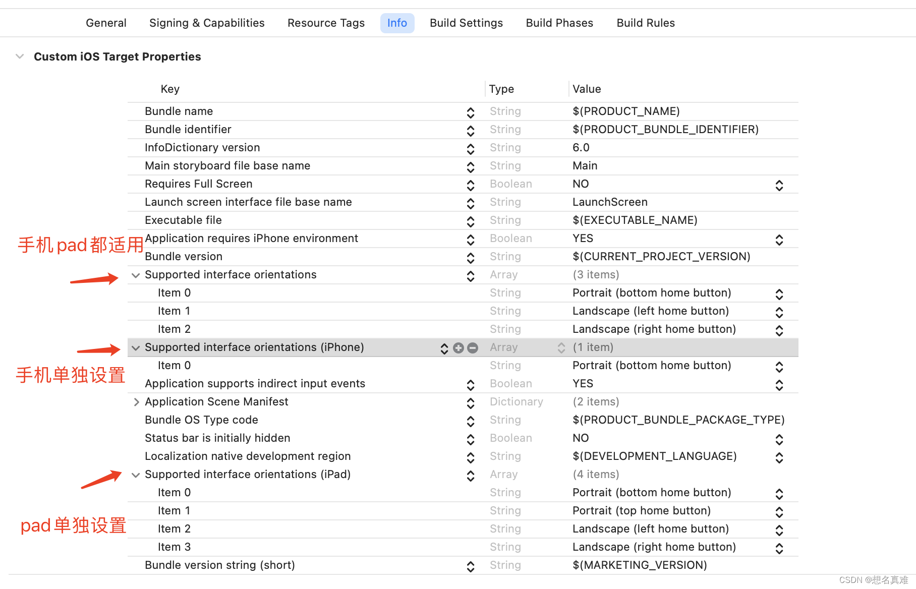 可以看到这种勾选方式允许你进行四个方向的配置,并且这种勾选方式会直接在你的项目plist文件中添加对应的key-value, 在plist中可以更精细的设置pad和手机, 比如手机上只支持竖屏, 而pad上支持全方向.