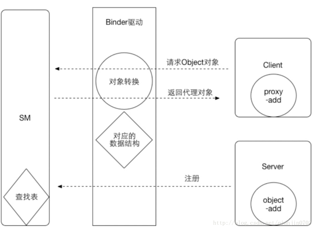 代理对象通过Binder驱动实现,将结果返回给Service Manager。